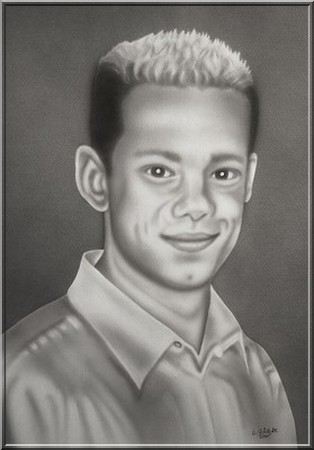 Personenportrait auf weißem Aquarellpapier (36x48 cm) in Airbrushtechnik, Detailausarbeitung mit Buntstift (Auftragsarbeit)