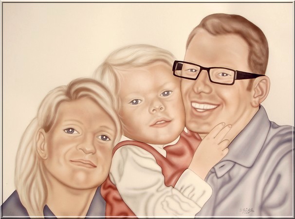 Personenportrait auf elfenbeinfarbenem Cansonpapier (50x65cm) in Airbrushtechnik, Detailausarbeitung mit Buntstift, Lichter radiert (Auftragsarbeit)