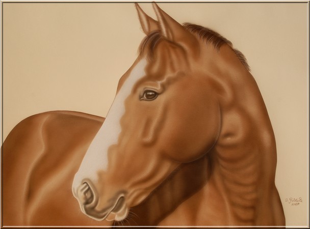 Pferdeportrait auf hellockerfarbenem MI-Teintes Cansonpapier (50x65 cm) in Airbrushtechnik, Detailausarbeitung mit Buntstift, Lichter radiert. Fotovorlagen von Susanne Gödeke (Auftragsarbeit)