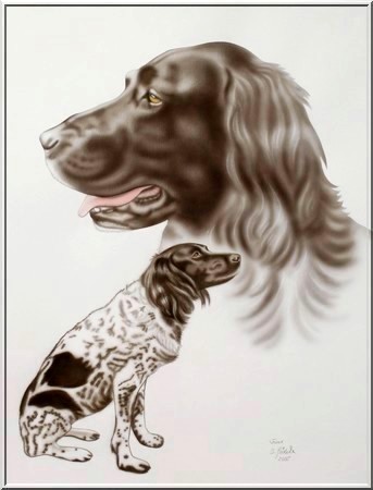 Gemeinschaftsportrait auf weißem Lana Colorpapier (50x70 cm) Mischtechnik: Acrylfarbe gesprüht, gemalt, Detailausarbeitung mit Buntstift, Lichter radiert (Auftragsarbeit)
