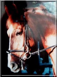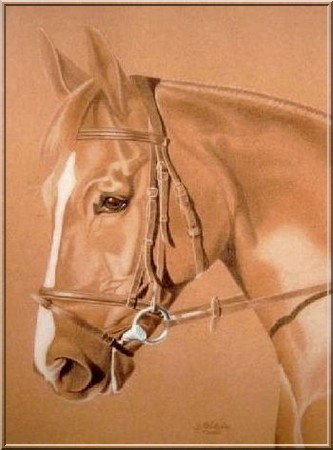 Pferdeportrait auf rotockerfarbenem Zeichenkarton (50x65 cm) Mischtechnik: Buntstift, Aquarell (Auftragsarbeit)
