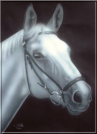 Pferdeportrait auf schwarzem Zeichenpapier (50x65 cm) Mischtechnik: Acrylfarbe gesprüht und gemalt, Detailausarbeitung mit Buntstift (Auftragsarbeit)