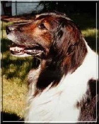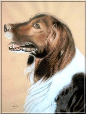 Hundeportrait auf hellockerfarbenem Zeichenpapier (50x65cm) Mischtechnik: Buntstift, Aquarellfarben gemalt und gesprüht, Acrylfarben gemalt (Auftragsarbeit)