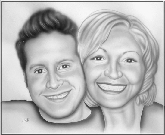 Personenportrait auf weißem Japicol Zeichenpapier (50x70 cm) Mischtechnik: Acrylfarbe gesprüht (Airbrush), Details mit Buntstift ausgearbeitet (Auftragsarbeit)
