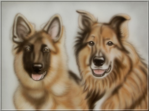 Hundeportrait auf MI-Teintes Cansonpapier (50x65 cm) in Airbrushtechnik, Detailausarbeitung mit Buntstift, Pastell, Lichter radiert (Auftragsarbeit)