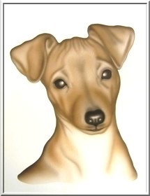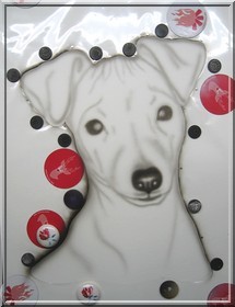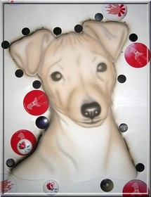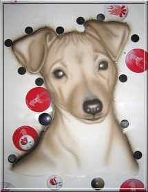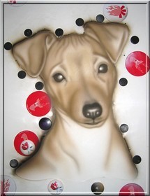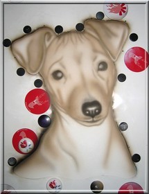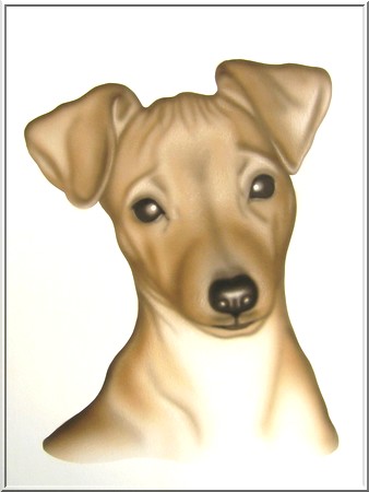Hundeportrait auf weißem Aquarellpapier (36x48 cm) in Airbrushtechnik.
