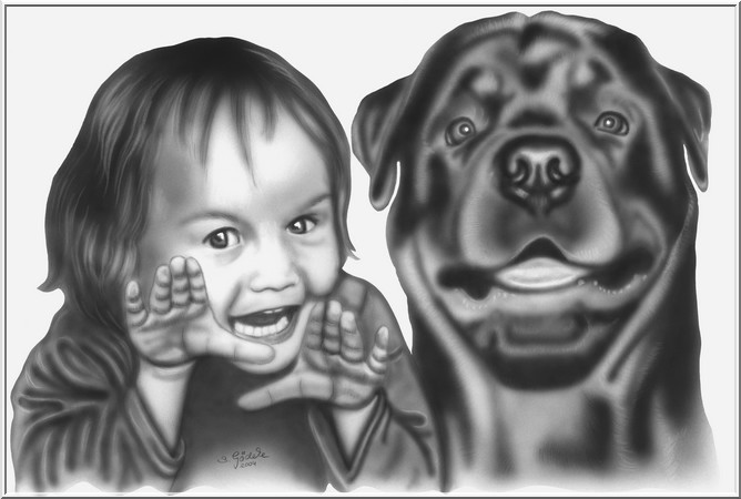 Gemeinschaftsportrait auf weißem Reinzeichenkarton (30x42 cm) Technik: Airbrush, Detailausarbeitung mit Buntstift, Lichter radiert (Auftragsarbeit)