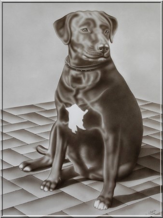 Hundeportrait auf MI-Teintes Cansonpapier (50x65 cm) in Airbrushtechnik, Detailausarbeitung mit Buntstift und Pastell, Lichter radiert (Auftragsarbeit)