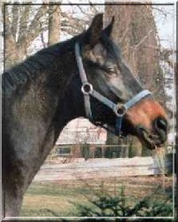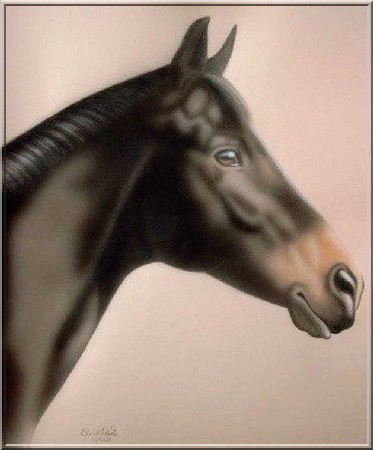 Pferdeportrait auf hellockerfarbenem Zeichenpapier, Mischtechnik: Acrylfarbe gesprüht und gemalt, Detailausarbeitung mit Buntstift und Pastell