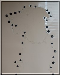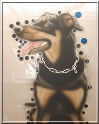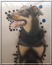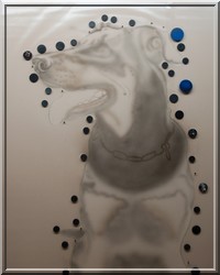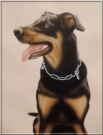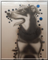 Hundeportrait auf hellockerfarbenem Zeichenpapier (50x65cm) Mischtechnik: Buntstift, Acrylfarben gemalt und gesprüht, Lichter radiert. (Auftragsarbeit) |