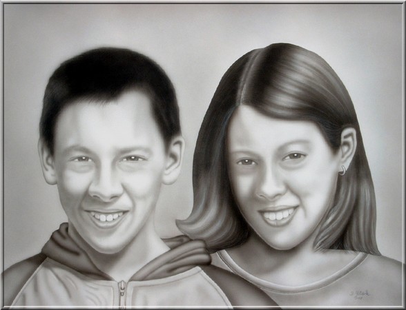 Personenportrait auf Schoellershammer Mal- und Zeichenpapier Nr. 12 (50x65 cm) in Airbrushtechnik. Die Details sind mit Buntstift ausgeführt, die Lichter radiert. (Auftragsarbeit)