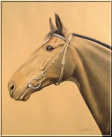 Pferdeportrait auf hellockerfarbenem Zeichenpapier (50x65 cm) Mischtechnik: Buntstift, Aquarell