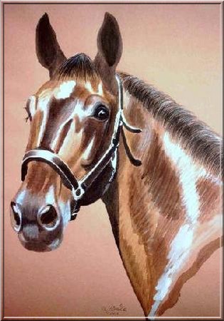 Pferdeportrait auf rehbraunem Fotokarton (50x70 cm) Mischtechnik: Aquarell, Detailausarbeitung mit Buntstift (Auftragsarbeit)