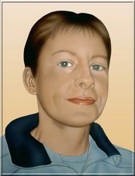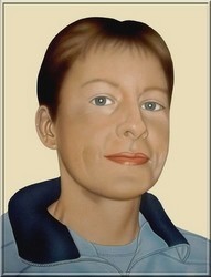 Personenportrait auf weißem Aquarellpapier (36x48 cm) in Airbrushtechnik, Detailausarbeitung mit Buntstift. |