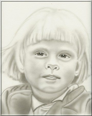 Kinderportrait auf weißem Aquarellpapier (3ox40 cm) in Airbrushtechnik, Detailausarbeitung mit Buntstift